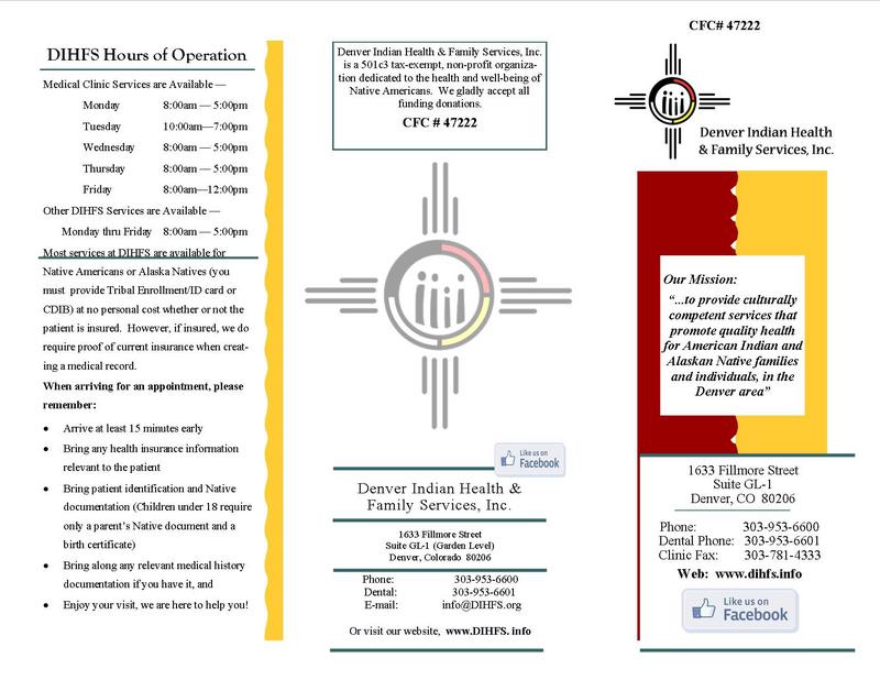 * We provide health and family services, (see "Our Services," tab above) and we work closely with our partners; the Denver Indian Center, Denver Indian Family Resources Center, and others. Visit "Our Community" page for details!